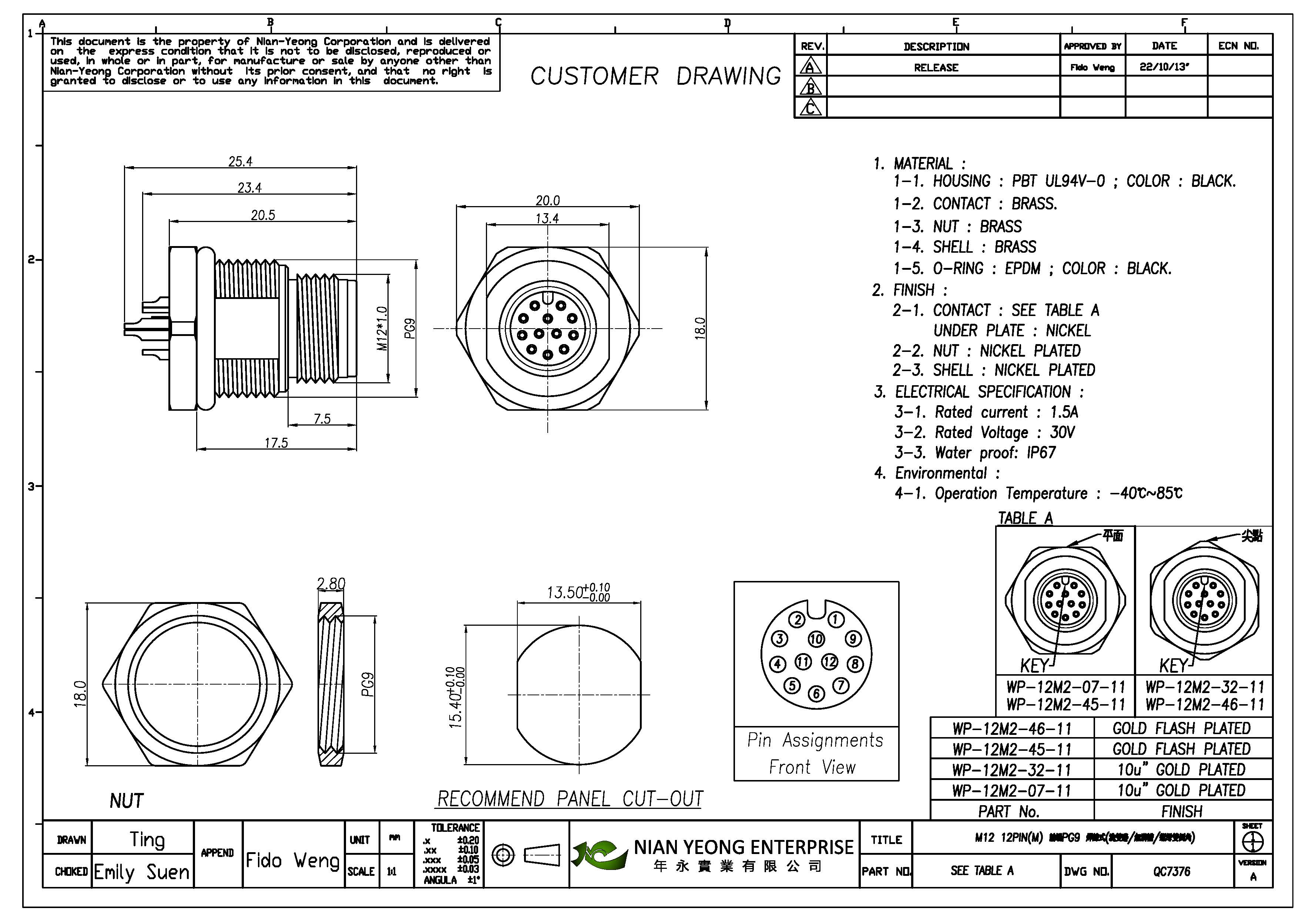 M12 公頭 12PIN A-Coded 前鎖焊線式防水連接器(Lock:PG9)/連接器