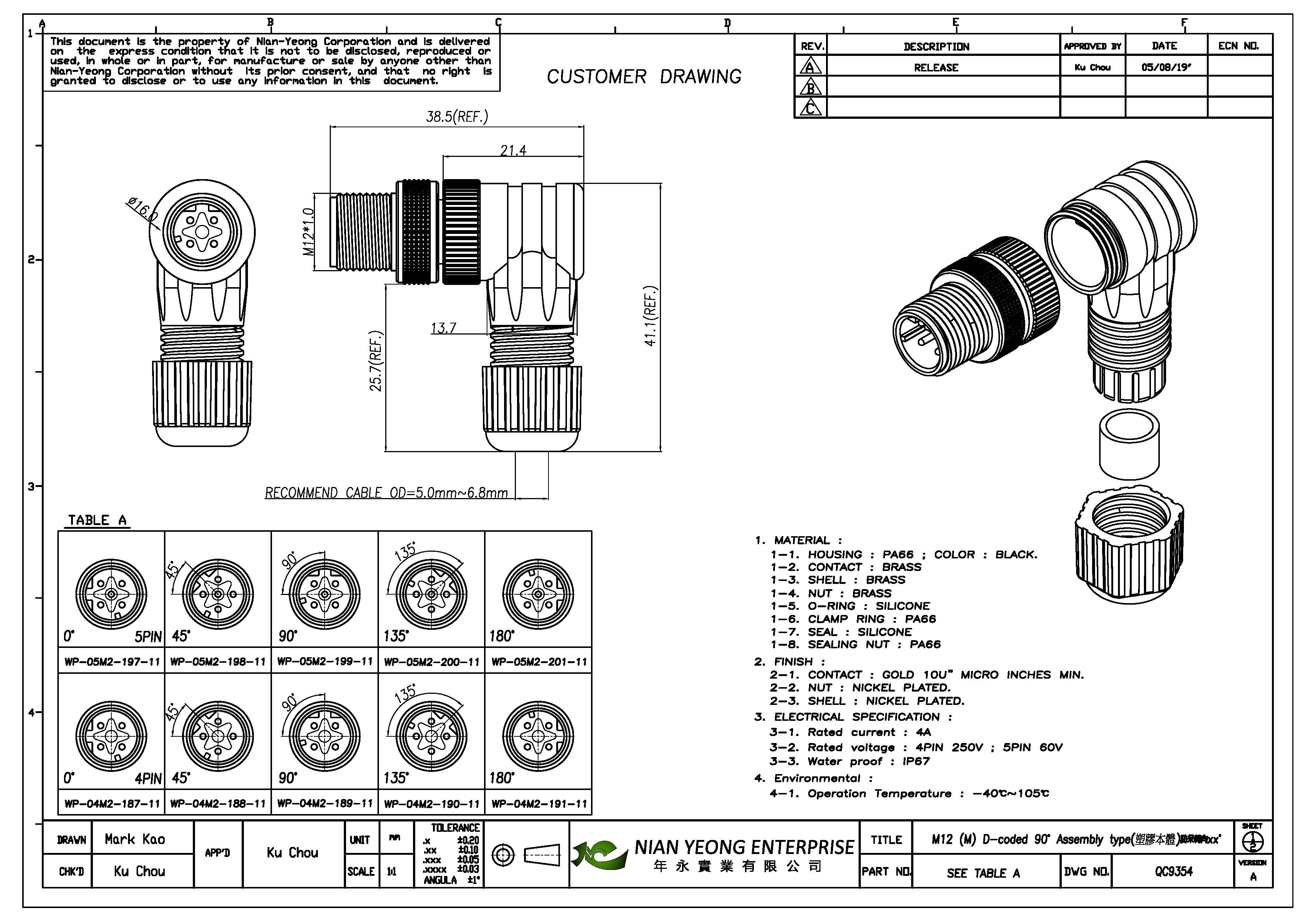 M12 公頭 5PIN D-Coded 90°組裝式防水連接器(key 90°)/連接器