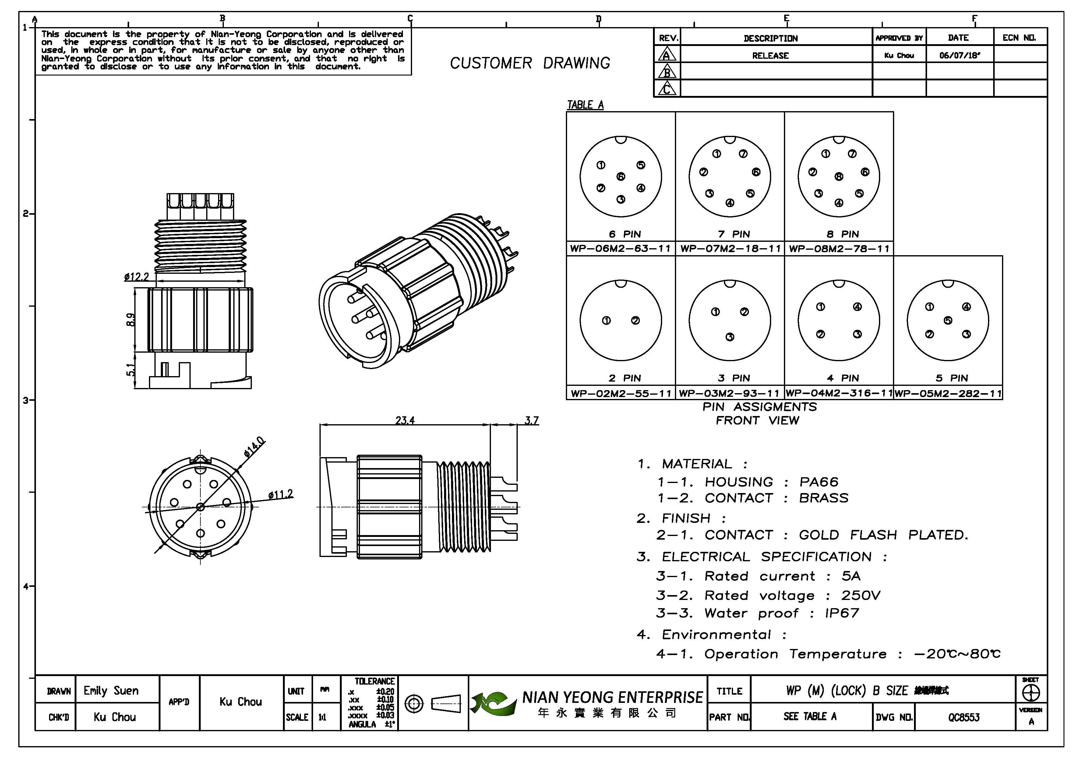 B Size (公身/公針) 5PIN 線端焊線式防水連接器(快鎖式)-5A/連接器